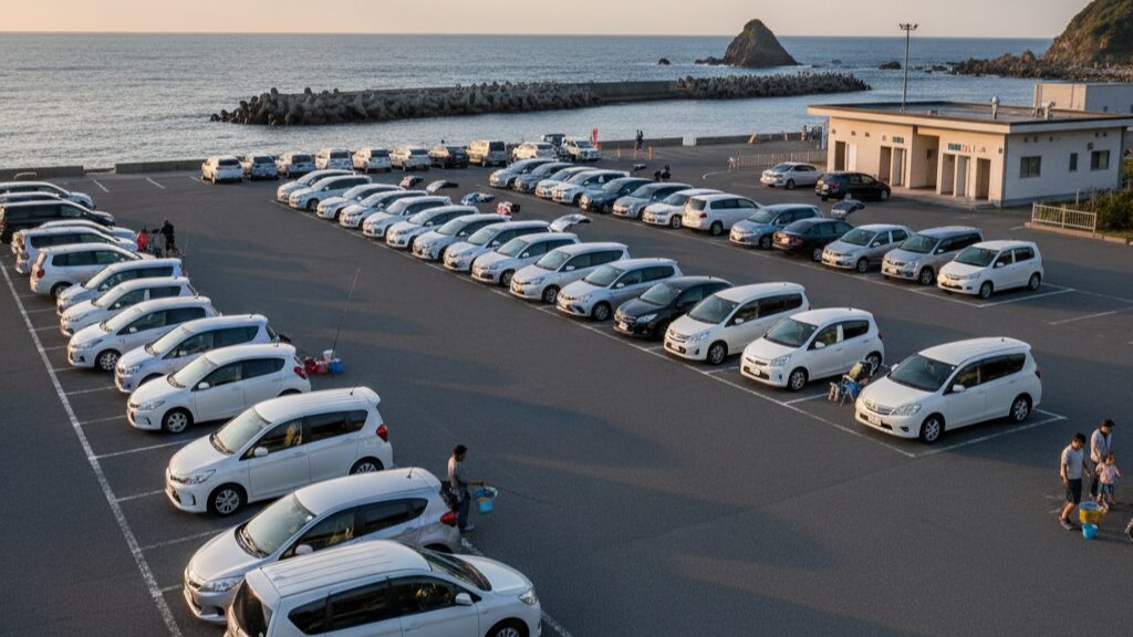 釣り場選びにおいて、駐車場の有無とその利便性は非常に重要な要素です。その点で森の鼻は、約40台を収容できる広大で整備された無料駐車場が完備されており、訪れる釣り人にとって大きなアドバンテージとなっています。駐車場はアスファルトで舗装されており、区画線こそありませんが、整然と駐車すれば十分なキャパシティがあります。何より、この駐車場から釣り場までは徒歩1分もかからないため、重い釣り具やクーラーボックスを運ぶ労力が最小限で済むのは計り知れないメリットです。