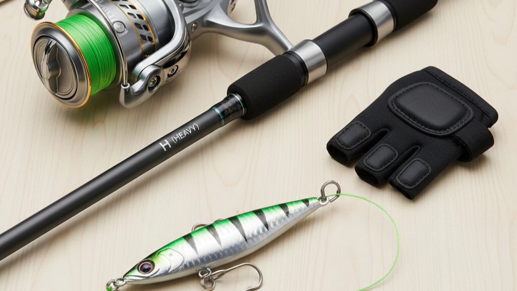 この重量級のジグを扱うためには、タックル全体もそれに見合ったパワーバランスで構築する必要があります。ロッドは10フィート(約3m)前後の長さで、硬さはMH(ミディアムヘビー)クラス、あるいはH(ヘビー)クラスが推奨されます。柔らかすぎるロッドでは60gのジグを背負いきれず、キャスト時に竿が負けてしまい飛距離が出ませんし、アクションをつける際にもキビキビと動かすことができません。