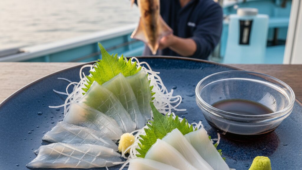 釣りたてのアオリイカは、身が透き通っており、コリコリとした非常に強い歯ごたえを楽しめます。これは産地でしか味わえない特権です。