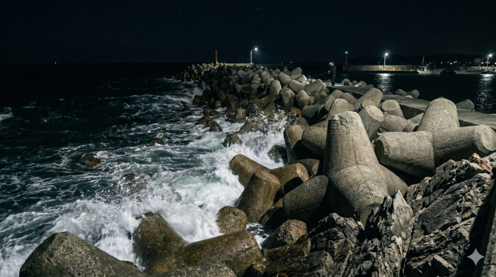 堤防の際、テトラ帯、岩礁が絡むポイントは、アジが着きやすい絶好のスポットです。しかしこうした場所では、魚を掛けた後のやり取り中にラインがストラクチャーに接触するリスクが常につきまといます。特にテトラ帯では、アジを掛けてから寄せるまでに、どうしてもラインが足元の障害物周りでは擦れやすくなるため、細糸での運用は極めて危険です。