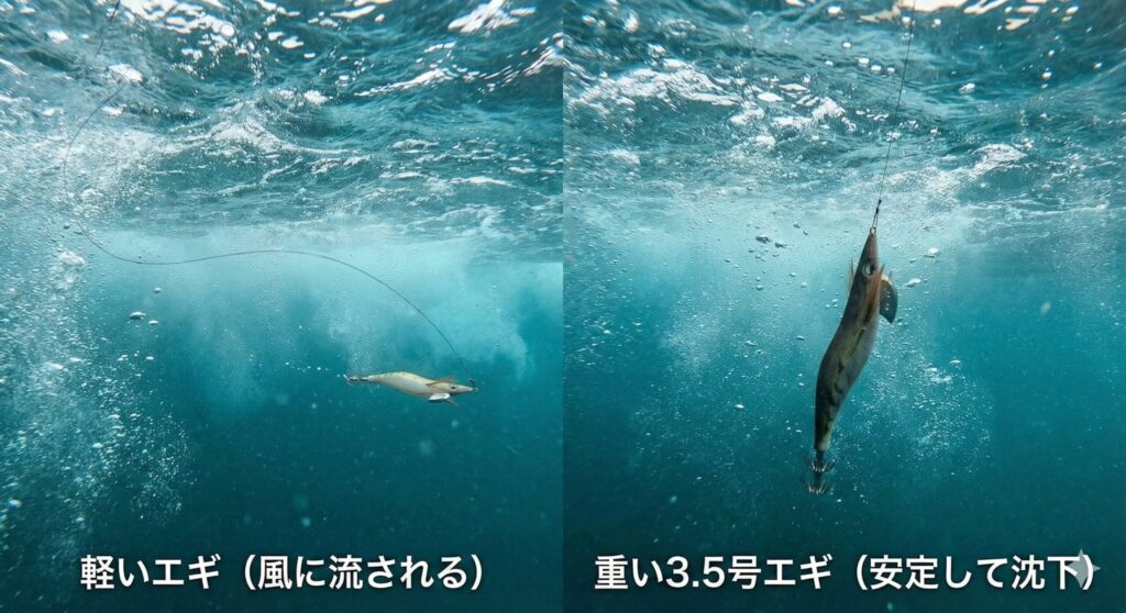 「軽くて操作しやすいエギ」を使いたい気持ちも分かりますが、風の日は「重くて存在感のあるエギ」を使う方が、結果としてライントラブルも減り、ボトム感知能力も維持できるため、釣果に繋がることが多いと私は確信しています。