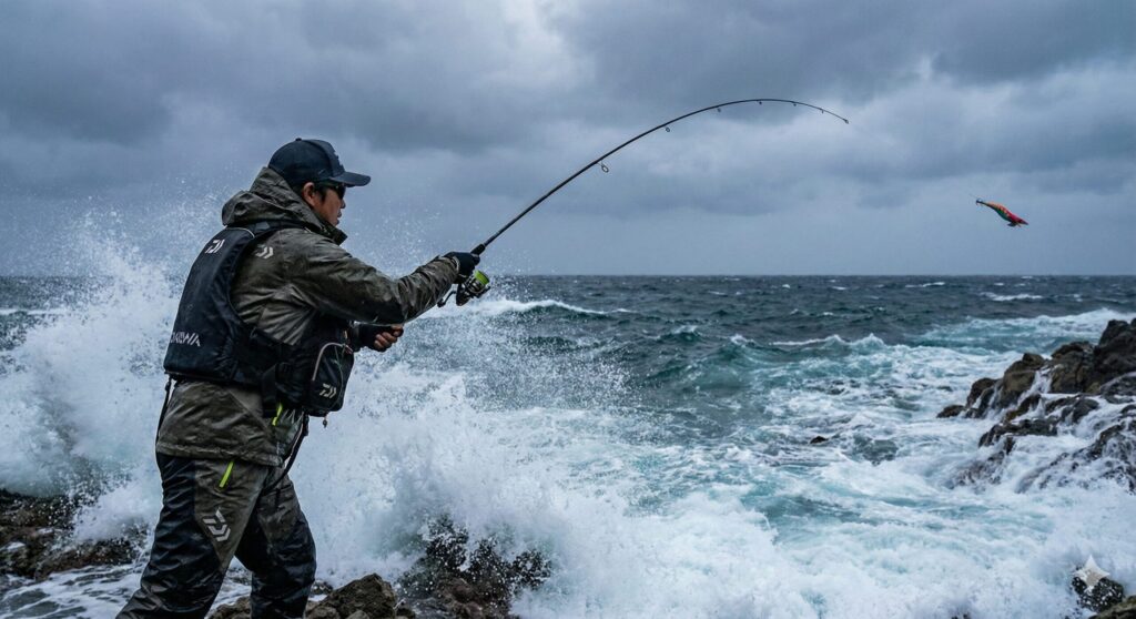 また、この25gという重量は、水中での安定感にも寄与します。荒れた海況では、波やうねりでラインが引っ張られ、軽いエギだと水中姿勢が崩れてしまいがちです。しかし、高重量のエギは慣性モーメントが大きく、多少のラインテンションの変化では動じず、どっしりと構えた安定したフォールを維持してくれます。これが、タフコンディションでも釣れる秘密なんですね。