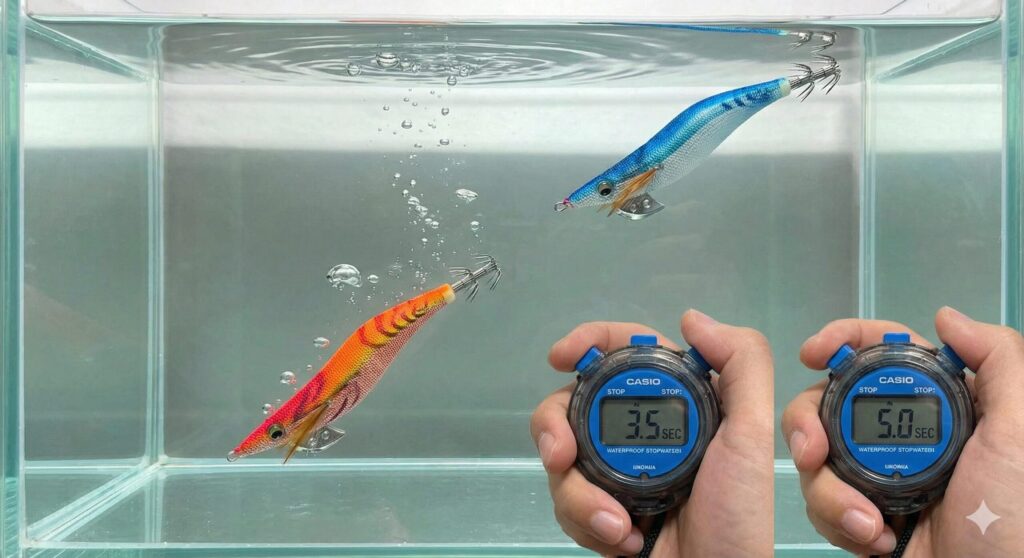 3.0秒/mのエギなら30秒で着底しますが、3.5秒/mのエギなら35秒かかります。この5秒間の差が、イカに対して「食わせの間」を長く与えることになり、結果としてバイト数が増えることがあります。逆に、活性が高い時は手返しが悪くなる原因にもなります。