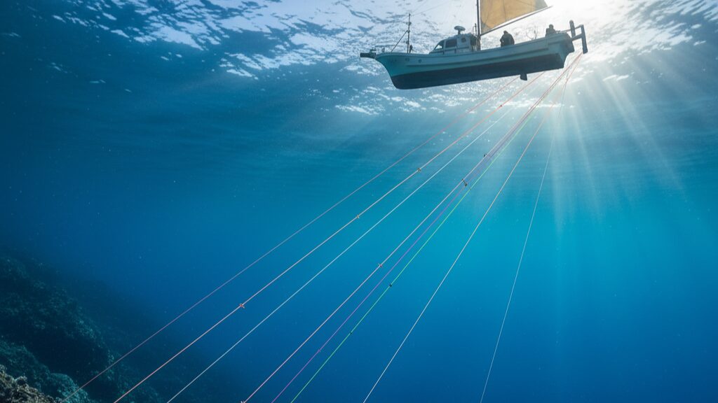 ドテラ流しとは全く対照的なのが、ディープジギング(中深海など)です。多くの場合、スパンカー(船の向きを固定する帆)やGPS制御のエンジンなどで船の位置をできるだけ固定(バーチカルキープ)して釣ります。