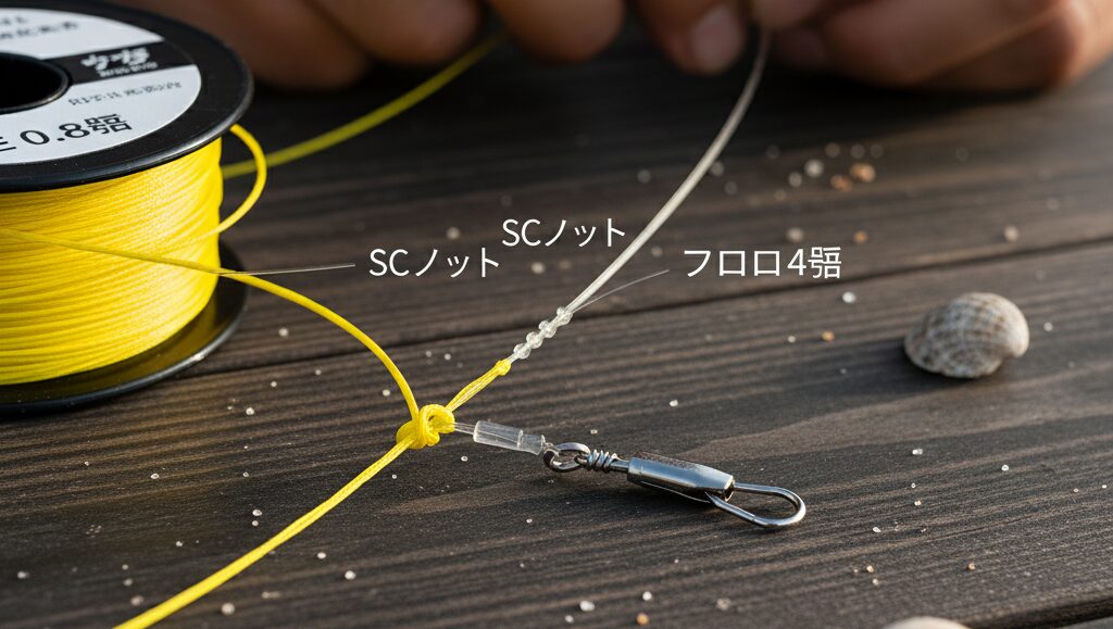 PEラインをオモリや仕掛けに直結すると、海底の岩やカキ殻、あるいはカレイの歯で一瞬で切れてしまいます。根ズレ対策と、キャスト時やフッキング時のショックを吸収するため、フロロカーボンかナイロンの3号(12lb)~4号(16lb)のリーダーを1m(矢引)ほど結束するのを忘れないでくださいね。