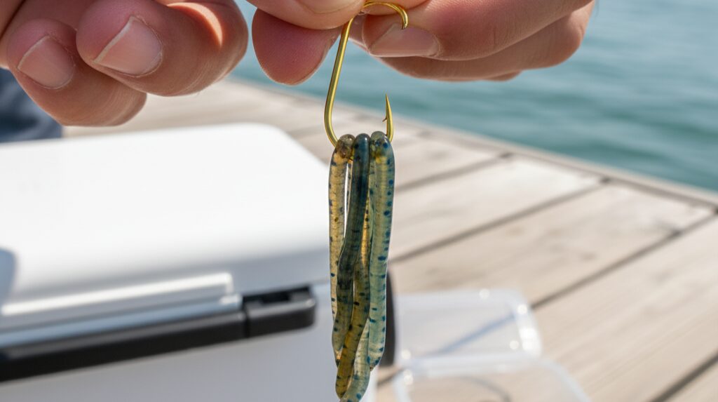これは、アオイソメを1匹だけチマっと付けるのではなく、3~5匹、時にはそれ以上を1本の針に刺して、フサフサの状態にする付け方。まさに「アオイソメのダンスパーティー」状態ですね。