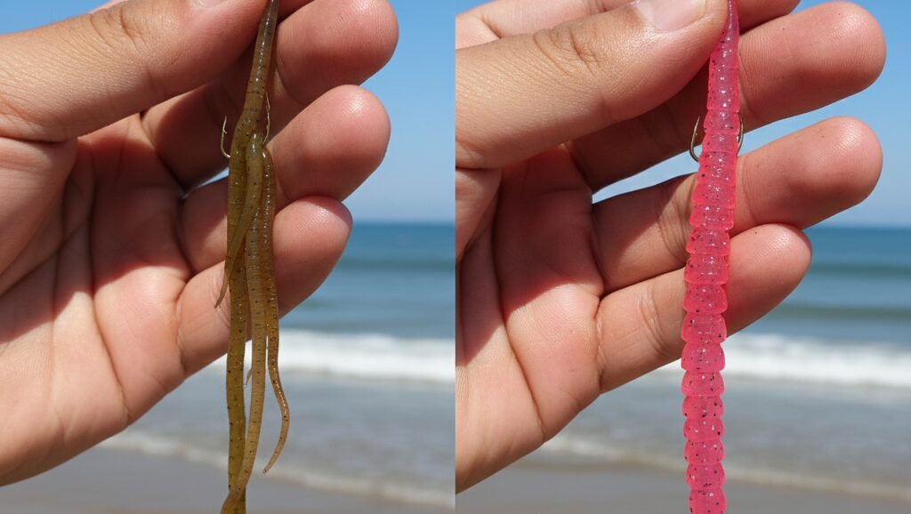 キス釣りで「ルアー」と言う場合、その中心となるのは「ワーム」と呼ばれるソフトルアーです。キスは主に海底の砂の中に潜むゴカイやイソメといった多毛類を捕食しているため、それに似せた形状や動きを演出できるワームが非常に効果的です。ハードルアーであるミノーやメタルジグで釣れることも稀にありますが、それは例外的なケースであり、基本はワームを使うものと認識してください。