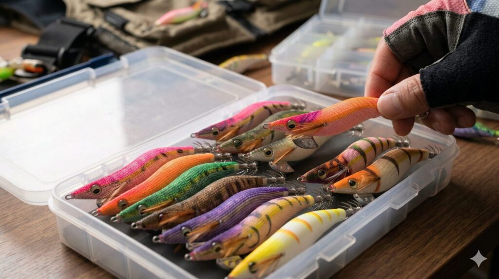 対照的に、日中の強い光がある状況や潮が澄んでいる時は、派手すぎるカラーはタコに警戒心を与えてしまうことがあります。この場合は、光を反射するシルバーやゴールド、あるいは周囲の環境に馴染むホワイトやブラウンといったナチュラル系カラーが効果を発揮します。カラーローテーションの極意は、タコにエギを「見つけてもらうこと」と「警戒させないこと」を状況に合わせて切り替えることです。アタリが止まった時に色をガラリと変えると、突然抱いてくることも多いので、数色のバリエーションを常に準備しておきましょう。夜釣りのカラー選びについては、夜釣りのルアー色選びの解説も役立ちますよ。