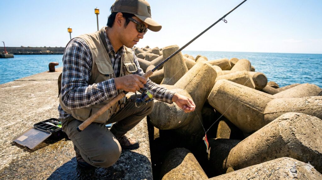 「昼間はタコは釣れないの?」と思われがちですが、そんなことはありません。ただ、夜のようにタコが自分から歩き回ってくれないだけなんです。昼間の戦略は、ズバリ「タコの家にこちらからお邪魔する」スタイルです。強い太陽光の下では、タコは外敵を避けるために岩の隙間やテトラの影、あるいは堤防の継ぎ目などに深く身を潜めています。したがって、タコがエサを求めて動き回るのを待つのではなく、彼らが潜んでいるピンポイントを直接狙う釣りが求められます。