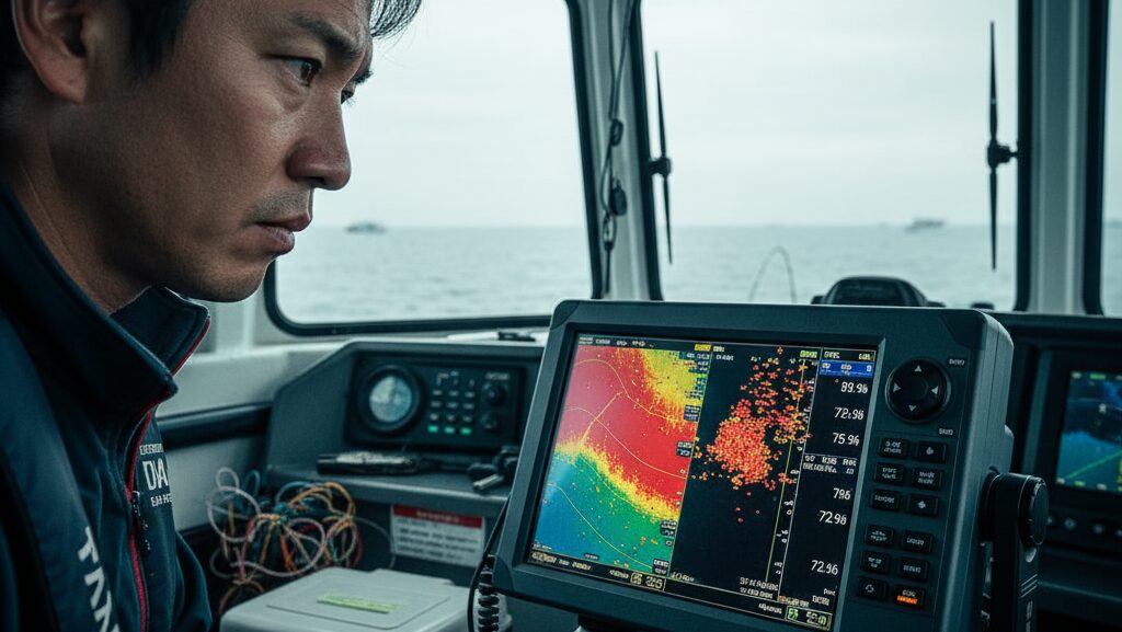 タチウオは、特定の水深に群れで固まっていることが非常に多い魚です。船長が「水深50mから70mあたりに反応あり」とアナウンスしてくれても、その20mの範囲の中で、さらに魚が集中している「濃いタナ」が存在します。この「濃いタナ」は、時には5m、あるいはそれ以下という狭い範囲に集中していることもあります。