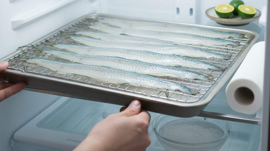 4. 魚焼きグリルの網やバットなどに乗せ、ラップをせずに冷蔵庫の中で一晩(約12~24時間)寝かせます。冷蔵庫内は乾燥しているため、衛生的に干物を作ることができます。