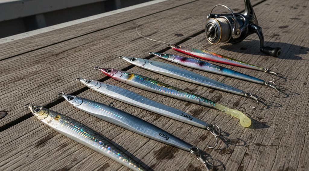 船からヤガラを狙う際の主役となるのがメタルジグです。水深や潮の速さに応じて100g~200g程度の重さを使い分けますが、重要なのはその形状とカラーです。
