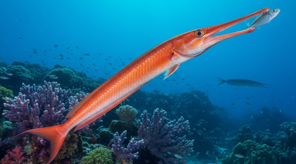 最大の特徴は、なんといっても細長い体と筒状に伸びた口(吻)です。この独特な口は、獲物を捕らえるための強力な武器として機能します。岩陰やサンゴの隙間に隠れている小魚や甲殻類を見つけると、スポイトのように口を使い、口を開く際に吻の内容積を4〜5倍に膨張させ、水ごと獲物を一瞬で吸い込んで捕食します。このユニークな捕食スタイルが、ヤガラの生態系のニッチを確立しているのです。