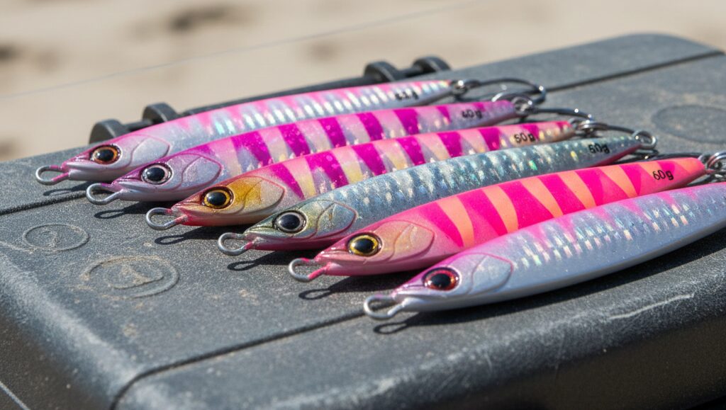 国府津のサーフショアジギングにおいて、ルアー(メタルジグ)のセレクトは生命線です。まず重さ(ウェイト)についてですが、基本は30g〜40gを基準(ベース)に考えてください。