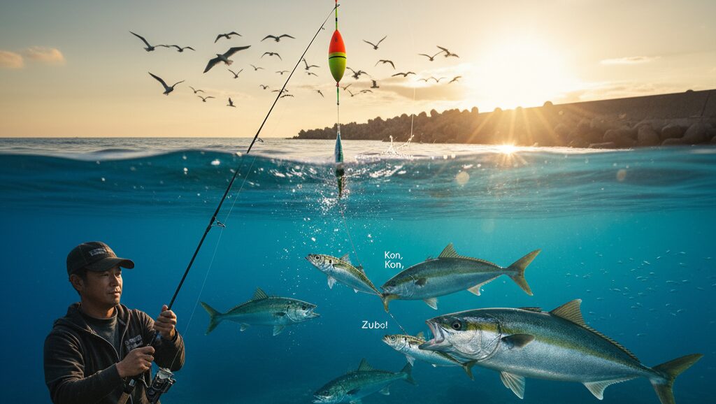 この仕掛けの最大のメリットは、なんといってもアタリが視覚的に明確に分かるところです。まず、ブリなどの大型魚が近づくと、危険を察知したエサが逃げ惑い、ウキがピョコピョコと不自然に沈んだり揺れたりする「前アタリ」が出ます。そして、ターゲットがエサに食いついた瞬間、ウキが抵抗も空しく「ズボッ!」と一気に海中に消し込む様子は、釣り人にとって最高の興奮を味わえる瞬間と言えるでしょう。また、潮の流れに乗せて仕掛けを広範囲に流すことができるため、特定の場所に留まらず回遊している青物などを効率良く探すのに非常に適しています。