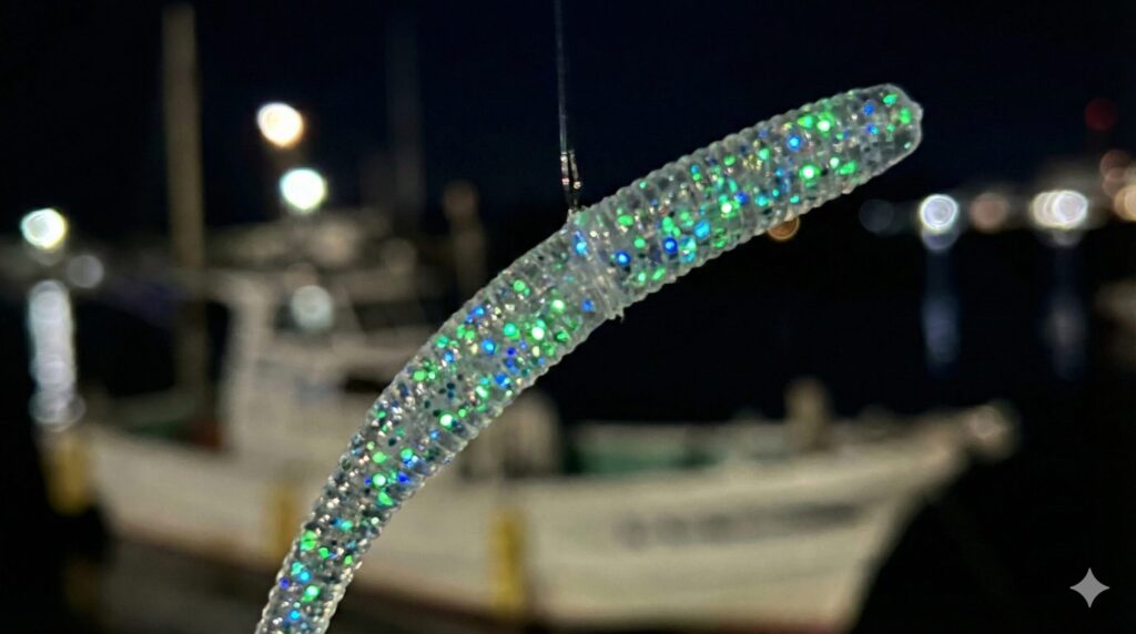 そんな時に私が重宝しているのが、近年絶大な人気を誇る点発光(ドットグロー)です。ワーム全体をボヤッと光らせるのではなく、練り込まれた発光粒子がポツポツと光ることで、プランクトンの集合体をリアルに再現します。これがアジの捕食本能を強烈に刺激するようで、他のカラーで当たらない時に独り勝ちできるパワーを秘めています。さらに、月明かりが強い時や、濁りが入った時は、ソリッド系のピンクや白を使ってシルエットを明確に出すのがコツ。アジングでは「ワームの透明度」と「発光の強さ」の2軸でローテーションを組むと、戦略に深みが出て、一匹ずつのプロセスがもっと楽しくなりますよ。