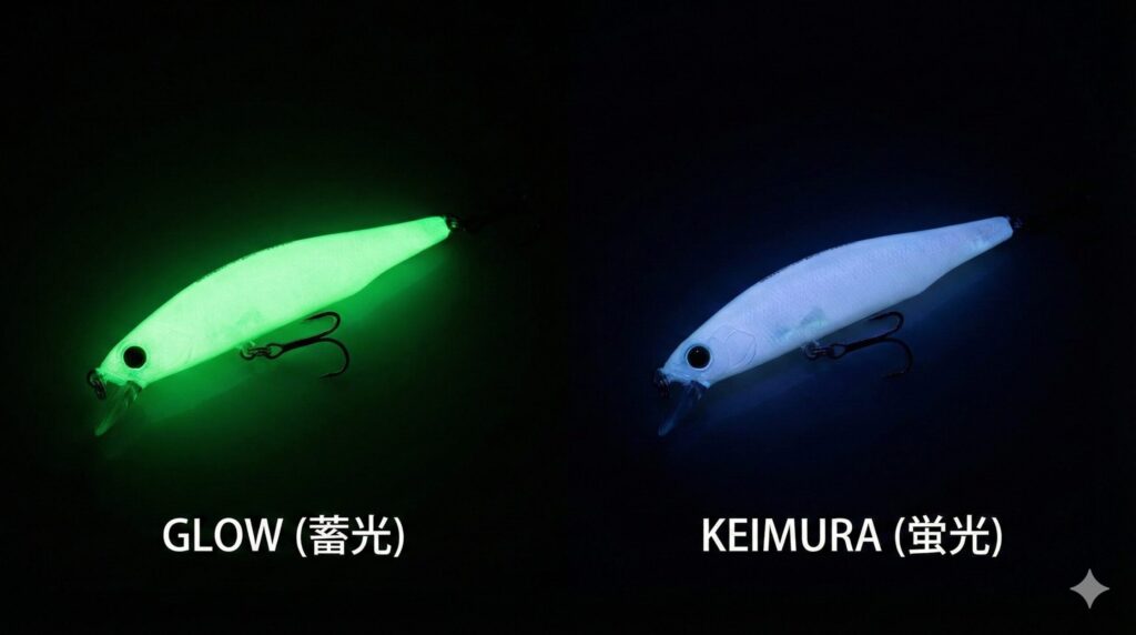 使い分けの基準として、私は「光の有無」と「魚の活性」を重視しています。完全な闇夜や深場なら、自発光するグローが有利。逆に、月が明るい夜や常夜灯周り、あるいはマズメ時など、わずかでも光がある状況では、より自然な発色をするケイムラの方がスレにくく効果的です。ケイムラは「魚にだけ見える怪しい光」を演出してくれるので、プレッシャーの高い釣り場での切り札になります。どちらも強力な武器ですが、グローはアピールが強すぎて「諸刃の剣」になることもあるので、反応が鈍くなったらすぐにケイムラやナチュラルカラーにシフトするのが賢明な判断です。