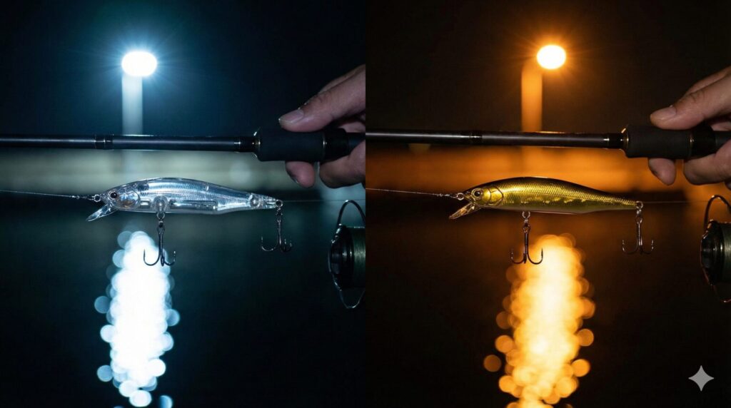 オレンジ色の光は、ゴールドやアカキン、オレンジといった同系色のルアーと相性が良く、光を強く反射して水中で膨張して見えます。私自身、ナトリウム灯の下でシルバー系を投げても反応がないのに、ゴールドに変えた途端に連発したという経験が何度もあります。これはルアーが背景の光の色と調和しつつ、適度なフラッシングを生んでいるためです。また、常夜灯の下では「影」の存在も忘れてはいけません。明るい場所から暗い場所へルアーが入った瞬間、ルアーの反射光がパッと消える「明滅効果」が魚の捕食スイッチを入れる最大のトリガーになります。光源の種類をチェックし、その光を効率よく反射するか、あるいは透過させるかを考えるのが、常夜灯攻略の醍醐味ですね。