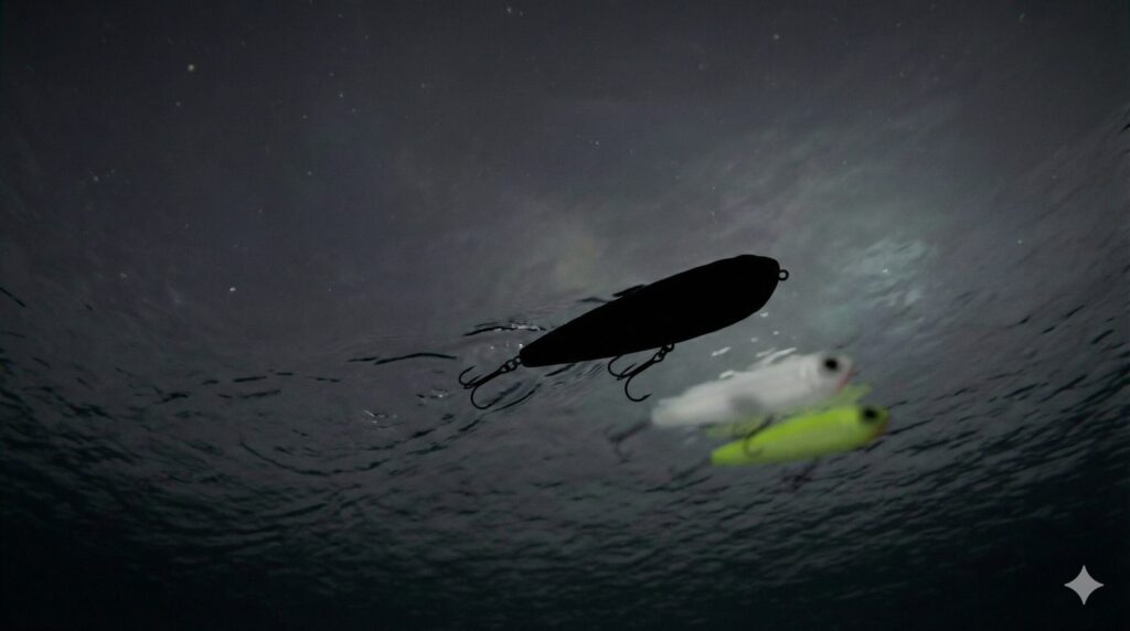 特に表層付近を攻めるトップウォーターゲームや、スローに誘うワームの釣りでは、この黒のシルエット効果は絶大です。魚は側線(そくせん)でルアーの波動を感じ取り、最後の一撃を加える際に視覚による確認を行いますが、その時に「はっきりとした存在感」を示す黒は、迷いなくバイトさせる力を持っています。私の中では、派手なアピール色で反応がないときの隠し球というよりは、むしろ状況を打破するための「最強の食わせカラー」として定着しています。シルエットを強調するという考え方は、夜釣りの戦略を劇的に広げてくれるはずですよ。