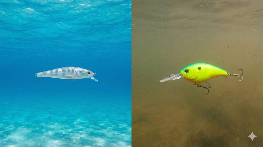 水質のコンディション、特に「濁り」の度合いは、ルアーカラーの視認性を決定づける大きな要因です。水が澄み渡っているクリアウォーターの状態では、魚の視界が良すぎるため、不自然な色は簡単に見切られてしまいます。この場合は、光を透過させるクリアカラーや、水馴染みの良いブルー、ゴースト系カラーを選択し、違和感を最小限に抑えるのが鉄則です。ルアーを「見せる」のではなく、「背景に溶け込ませつつ、微かな波動で気付かせる」というイメージですね。対照的に、雨上がりや時化(しけ)で水がコーヒー色に濁っているマッディウォーターでは、とにかく存在をアピールしなければなりません。