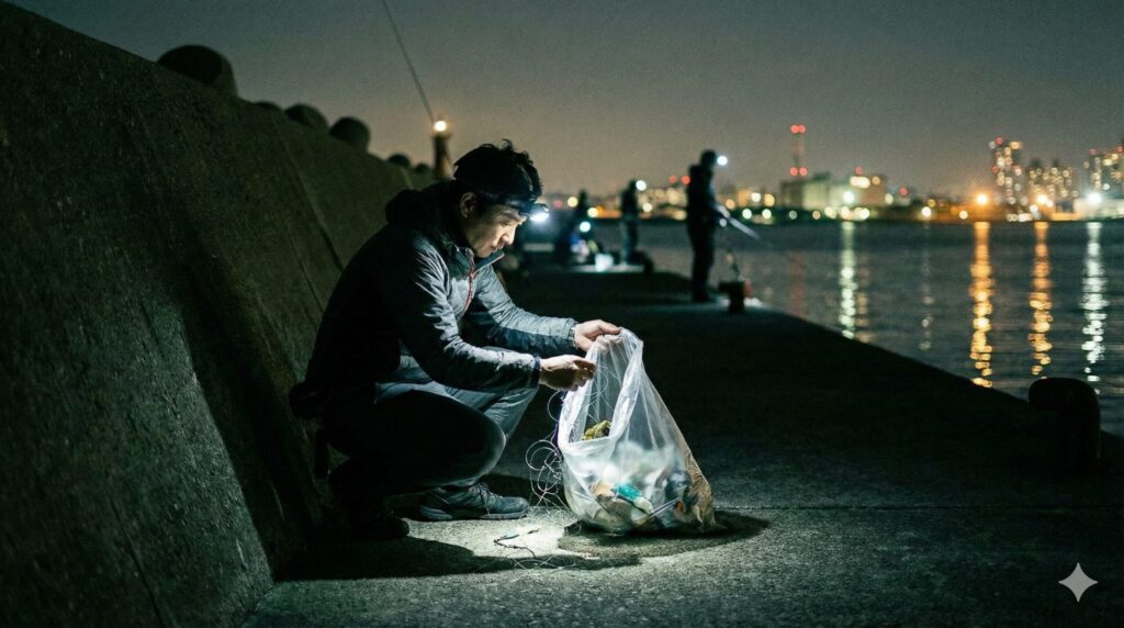 常夜灯周りの釣りでは、あまりライトを水面に直接向けないことも大切です。魚は光に寄ってくるとはいえ、不自然な光(特に人為的なヘッドライトの直射など)には非常に敏感で、一瞬で群れが散ってしまうこともあります。常夜灯の恩恵を受けつつ、自分自身の存在は消す。この「忍び」のような意識が、夜の堤防で竿を出すアングラーには求められるのかなと思います。
