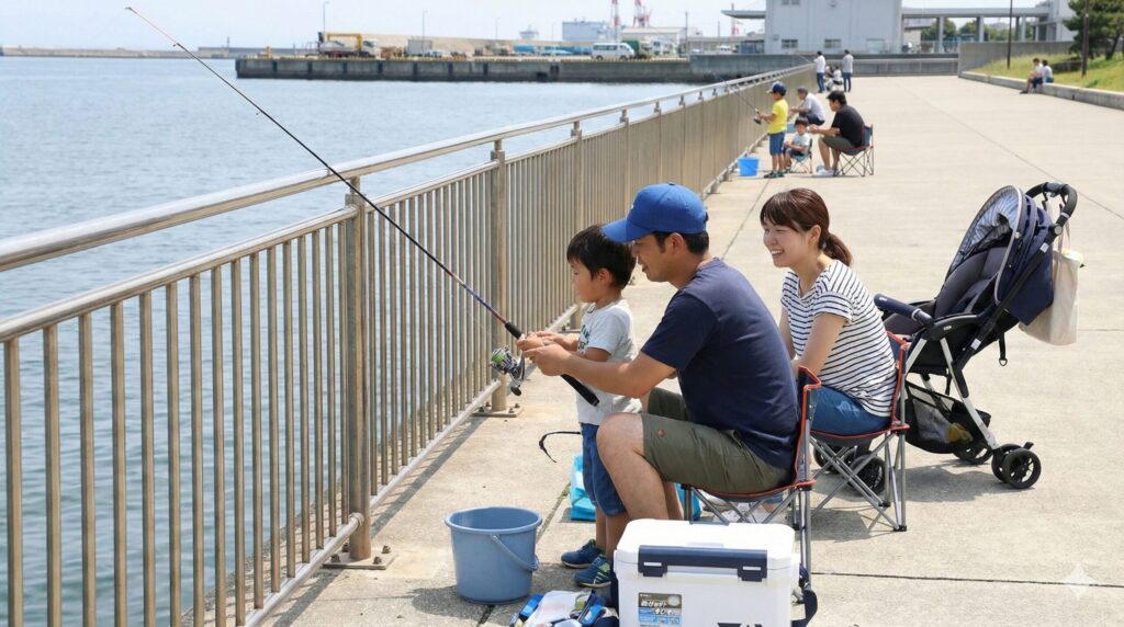 なぎさ公園の最大の特徴は、護岸の多くの区間に高さ約1メートルの安全柵が設置されている点です。これにより、元気なお子様が海へ転落するリスクが低く抑えられており、親御さんも心にゆとりを持ってサビキ釣りを楽しめるかなと思います。ただし、一部の作業船が接岸するエリアや角の部分には柵がない箇所も存在するため、現地では必ず看板の指示に従い、お子様から目を離さないようにしましょう。足元は平坦なコンクリートで整備されており、ベビーカーの持ち込みもスムーズです。私自身、子供が小さい頃はここでのサビキ釣りで「釣りの楽しさ」を教えた思い出深い場所でもあります。