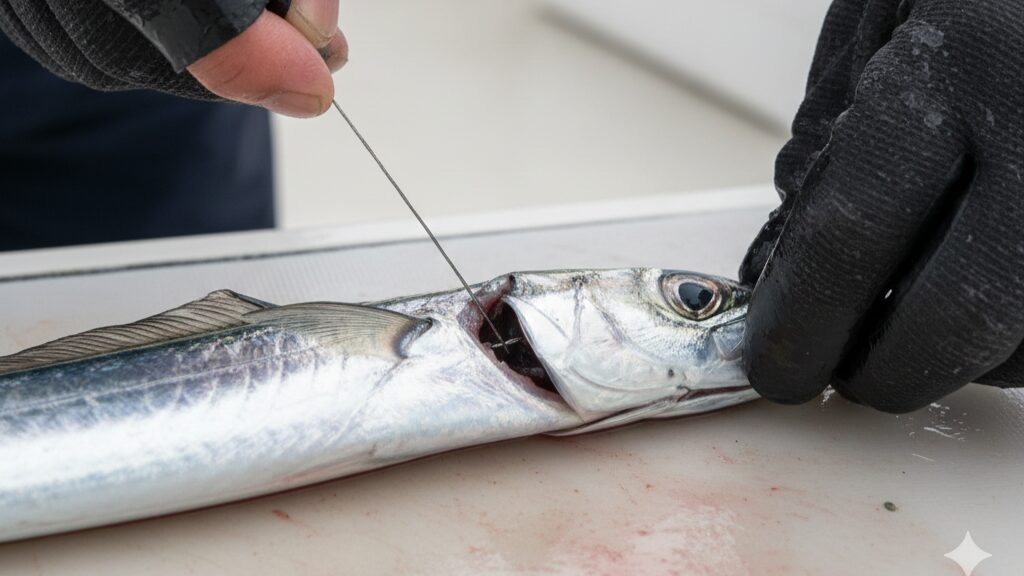 市場にはステンレス製やチタン製など様々なワイヤーがありますが、私が太刀魚用として絶対的な自信を持っておすすめするのは、「形状記憶合金(ニッケルチタン等)」素材のワイヤーです。ステンレス製のワイヤーはコシがあって入れやすい反面、硬すぎて柔軟性に欠けます。太刀魚のように微妙に湾曲した長い背骨の中に通していくと、途中でカーブに追従できず、骨の内壁を突き破って外に出てしまうことがよくあります。