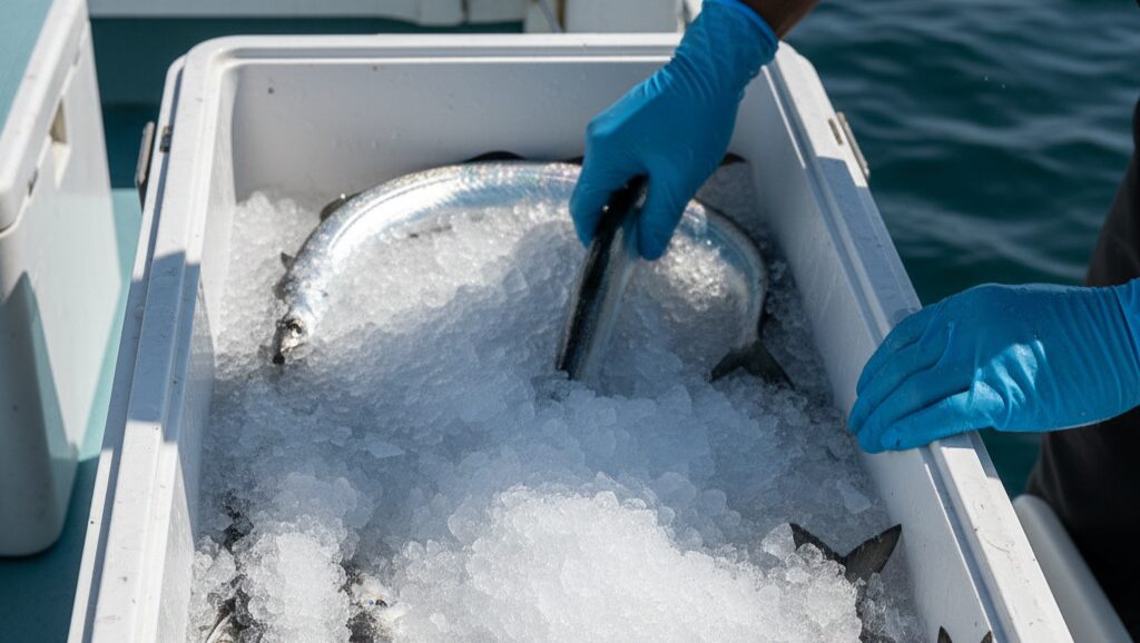 太刀魚の冷却に最適なのは、氷と海水を混ぜて作る「海水氷(潮氷・シャーベット氷)」です。液体である海水氷は、固体の氷よりも熱伝導率が高く、魚体の表面全体を隙間なく包み込むことができるため、魚の深部体温を一気に下げることができます。