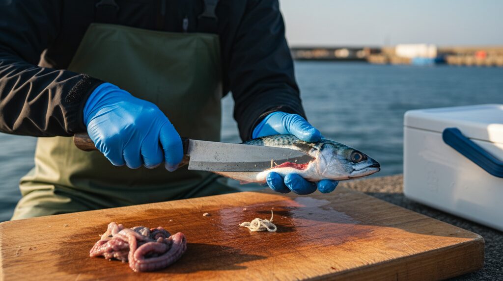 • 速やかな内臓処理(最重要): アニサキスは通常、魚の内臓に寄生していますが、魚が死ぬと内臓から筋肉(身)へと移動します。これを防ぐため、釣れたら可能な限り速やかに(できれば釣り場で)内臓を取り除くことが最も重要です。