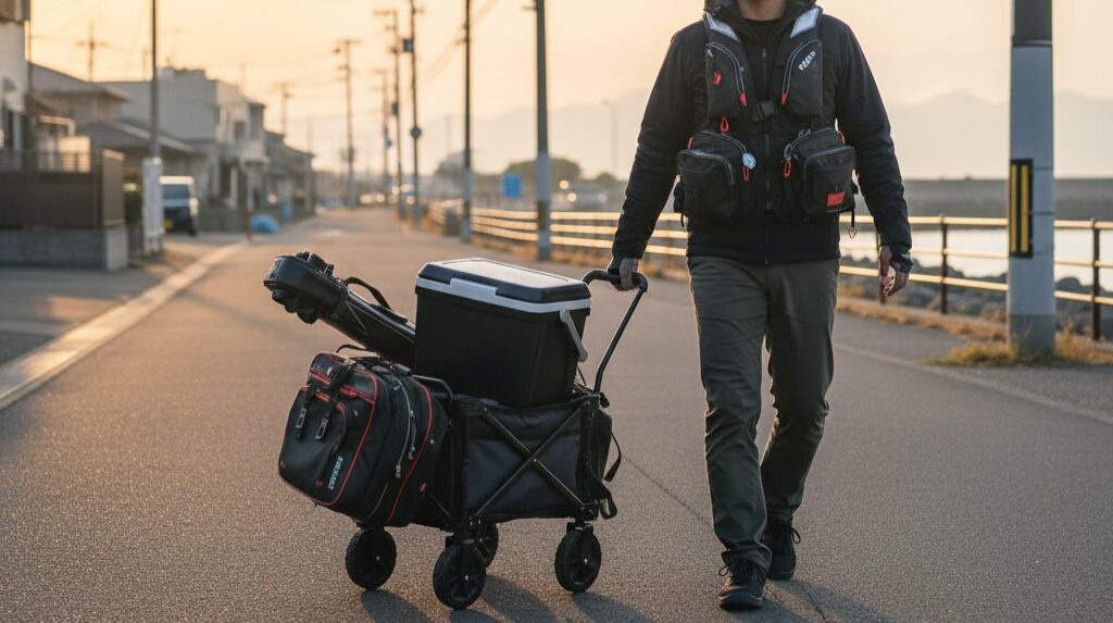 上記の通り、どちらの駐車場を利用しても釣り場までは徒歩で10分〜15分程度かかります。クーラーボックスやタックルを持って歩くのは正直しんどい距離ですので、折りたたみ式のキャリーカートを用意しておくことを強くおすすめします。これがあるだけで移動の疲労度が全く違いますし、帰りに大物が釣れて重くなっても安心ですよ。