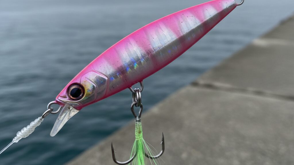 使用ルアーは85gの撃投ジグ(ピンクグロー)でした。ここで注目したいのは「85g」という重さと「ピンクグロー」というカラーです。明石の激流の中では、軽いジグだと底を取る前に流されてしまい、魚のいるレンジ(水深)に届きません。しっかりと底を取り、中層まで巻き上げてからのフォール、そして再着底後のワンピッチジャークで「ガツン」と食わせる。この一連の動作を成立させるための85gなんですね。