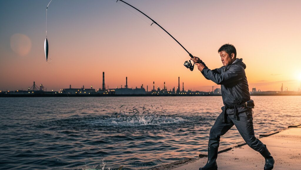 - 日中(デイゲーム): 太陽が出ている時間は、アジは海底付近(ボトム)の障害物周りや、基礎の捨て石周りにタイトについています。この時間はサビキ釣りでも「下カゴ」を使って底まで沈めないと、なかなか反応が得られません。