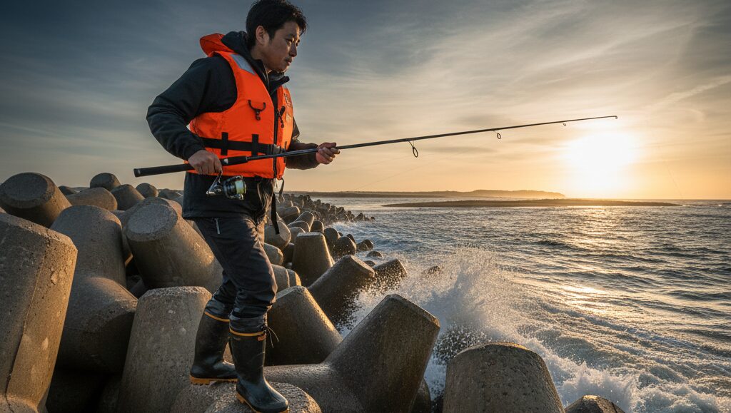 しかし、このエリアは危険も伴います。テトラ帯は滑りやすく、万が一落水すれば大事故に繋がりますので、スパイクシューズやライフジャケットの着用は絶対条件です。また、砂州の形状は大雨や台風のたびに大きく変化し、急に深くなっている場所や、流れが速くて足を取られる場所もあります。ウェーディングをする際は、必ずエイガード(毒針を持つエイからの被害を防ぐ装備)を着用し、無理な入水は避けて、安全マージンを十分に取った行動を心がけてください。ランディング(魚の取り込み)も足場が高い場所では難しいので、柄の長いタモ網(5m以上推奨)の携行をお忘れなく。
