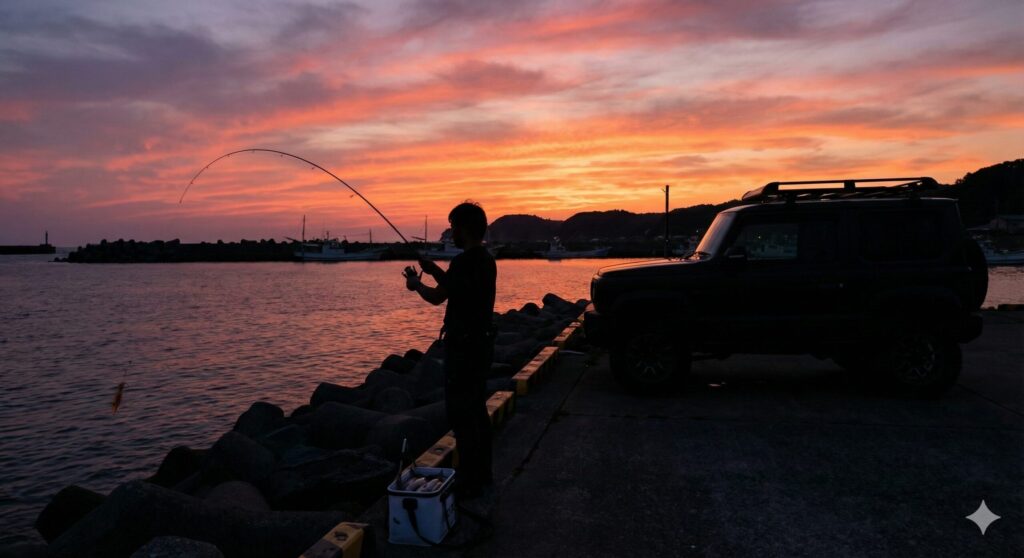 夜の海は、昼間とは全く異なる表情を見せてくれます。車横付けができる場所で、さらに明るい常夜灯があるポイント(犬熊漁港など)は、夜釣りの絶好のフィールドになります。常夜灯の光は、まずプランクトンを引き寄せ、それを食べる小魚が集まり、さらにその小魚を狙ってアジやアオリイカ、メバルなどの捕食者がやってくるという「命の連鎖」を作り出します。この「光の力」をうまく利用するのが、夜釣りを攻略する最大のコツです。車がそばにあれば、道具の整理もしやすく、夜間でも安心して釣りを楽しめます。