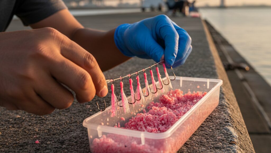 トリックサビキとは、専用の二股の針に、実際の生のアミエビを擦り付けて釣る方法です。擬似餌ではなく「本物のエサ」が付いているため、魚の食いつきが段違いです。周りが普通のサビキで沈黙している中、トリックサビキを使っている人だけが入れ食い状態…という光景を何度も見てきました。