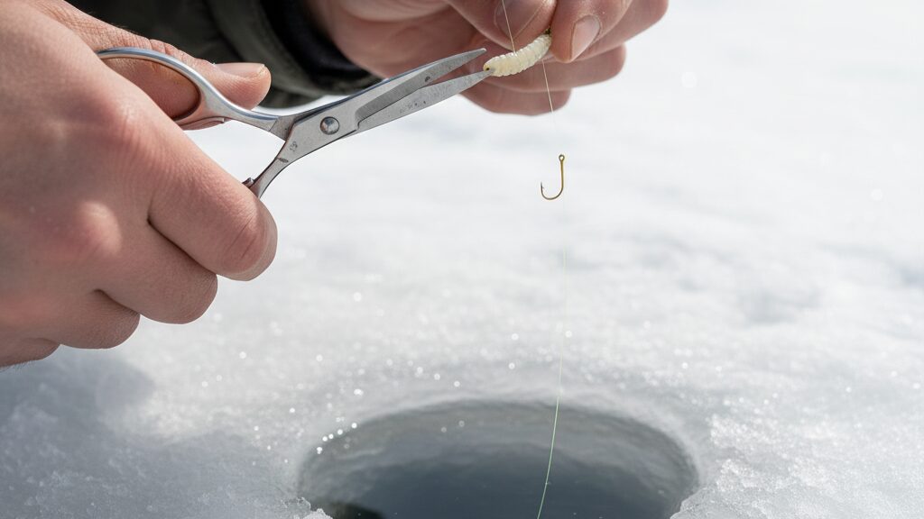 エサの付け方一つで、ワカサギの反応は劇的に変わります。「ただ針にチョン掛けして終わり」では、赤城のワカサギは振り向いてくれません。私が現場で必ず実践し、最も効果を感じているテクニックが「エサの極小カット」です。