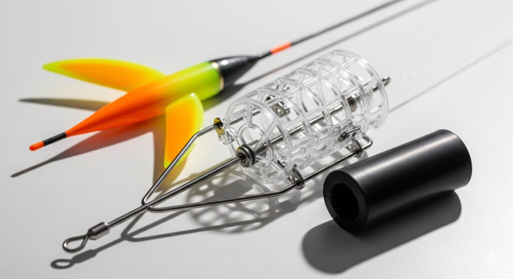 基本となる道具は、大きく分けて「ウキ」「カゴ(天秤)」「クッションゴム」「ハリス・針」の4点です。初心者のうちは、飛距離よりも「トラブルの少なさ」を優先して選ぶのが正解かなと思います。カゴにはプラスチック製のシャトルタイプや、ベテランに人気のステンレス製などがありますが、まずは着水時にエサが漏れにくい蓋付きのプラスチックカゴから始めるのがおすすめです。これにより、狙った水深(タナ)に到達してから確実にコマセを放出することができます。