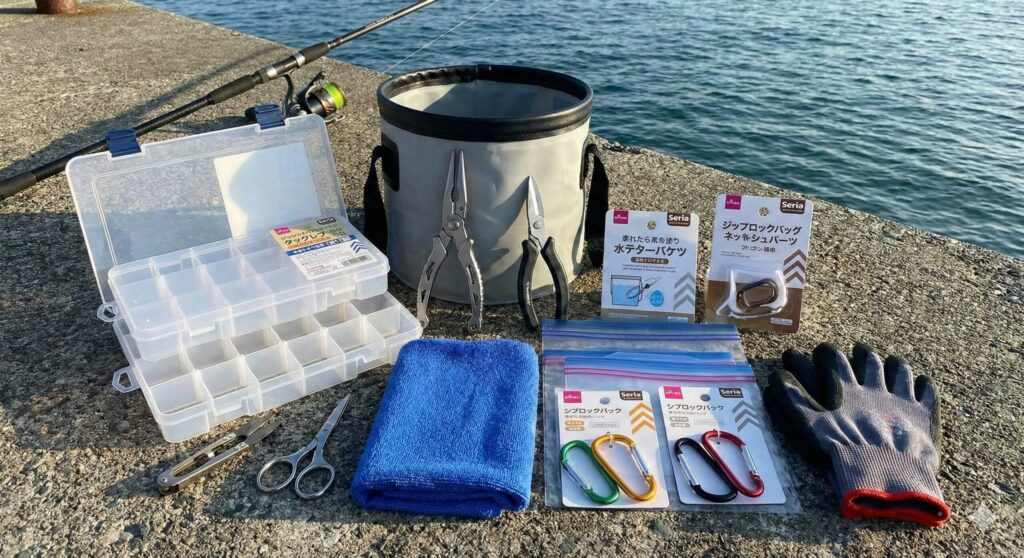 メインの道具が揃ったら、次は釣行を快適かつスムーズに進めるための小物類です。これらをどう選ぶかで、現場での「手返しの良さ」や「快適度」が大きく変わってきます。賢いアングラーは、100円ショップと釣具店を上手に使い分けていますよ。