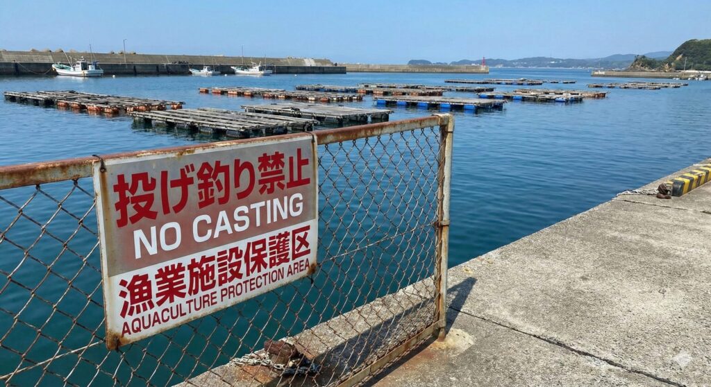 2023年頃から、釣姫漁港では「防波堤先端方向および養殖いかだ方面への遠投」が制限されています。これは特定の方向への投擲を禁止するもので、非常に具体的なルールとして運用されています。なぜこのような厳しい制限が必要になったのか、その背景を知っておくことが、トラブル回避の第一歩です。