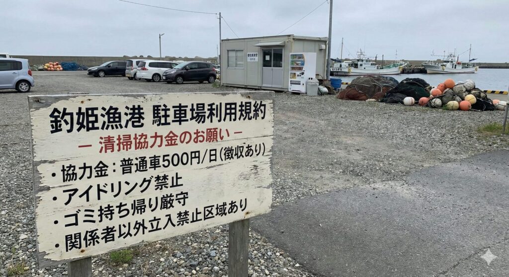 釣姫漁港を快適に利用するためには、現地の駐車ルールを必ず守りましょう。漁港内には比較的広い駐車スペースが確保されていますが、漁業者の方々の作業場でもあることを忘れてはいけません。駐車する際は、漁網や船の近くを避け、指定された場所に正しく止めましょう。
