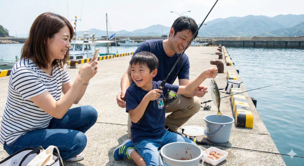釣姫漁港はファミリー層にとっても非常に優しい釣り場です。特に夏休みシーズンのサビキ釣りは、豆アジやイワシが堤防の内側まで回遊してくるため、お子様連れでも手軽に「魚が釣れる喜び」を体験できます。狙い目の時期は6月下旬から10月頃まで。この期間は海水温が安定し、多くの回遊魚が港内に留まってくれます。