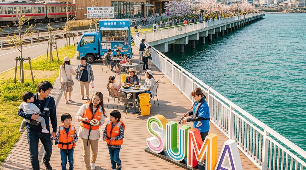 さらに、今回のリニューアルで最大の目玉とも言えるのが、釣り目的でなくても誰もが気軽に立ち寄れる新スポット「SUMAてらす」の併設です。美しい海を目の前に望むこの開放的な空間には、カフェや食堂、フォトスポットなどが整備されています。釣りをしている家族を待つ間の休憩場所として、また、純粋に海辺の景色を楽しむための場所として、多くの人で賑わう新たなランドマークとなっています。これにより、須磨海釣り公園は単なる釣り施設から、誰もが楽しめる海辺の総合レクリエーション施設へと大きく進化を遂げました。