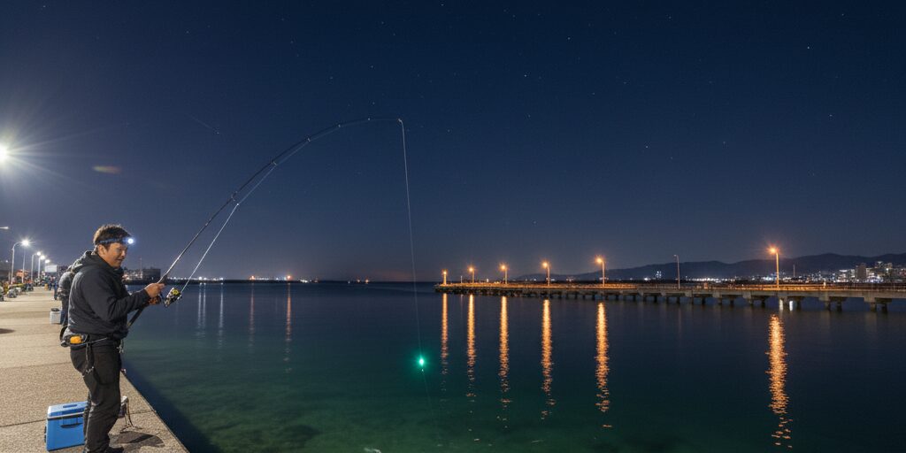 この状況になれば、軽量なジグヘッド(1g前後)とワームを使った「アジング」が成立しやすくなります。常夜灯の明かりと暗闇の境目(明暗部)を通すようにリトリーブすると、「コンッ」という金属的なアタリが出るのは病みつきになりますよ。また、電気ウキを使った餌釣りでも、タナ(ウキ下)を浅く設定することで効率よく釣ることができます。