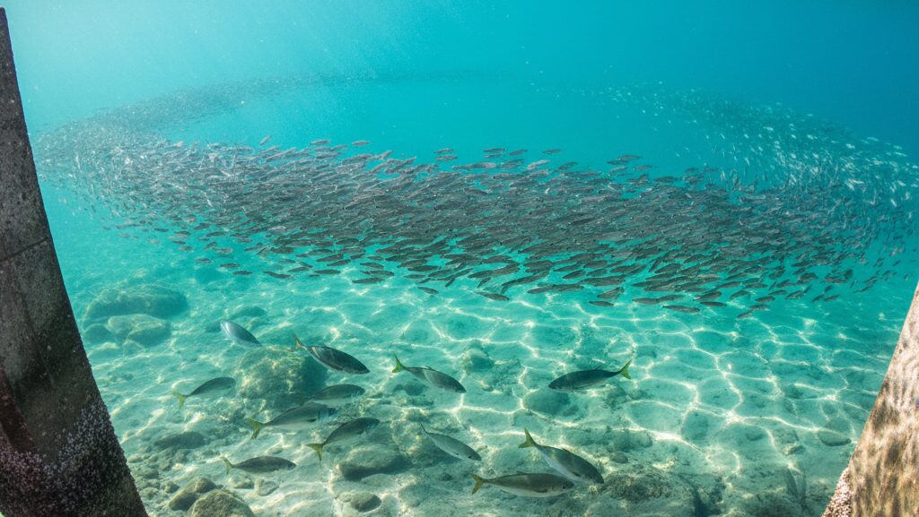 実際に2025年の春先、4月頃の映像記録などを見ると、堤防の足元にカタクチイワシの巨大な群れが帯のように泳いでいるのが目視で確認されています。まるで水族館の水槽を見ているかのような光景ですが、この「透明度の高さ」は釣りにおいて二つの意味を持ちます。