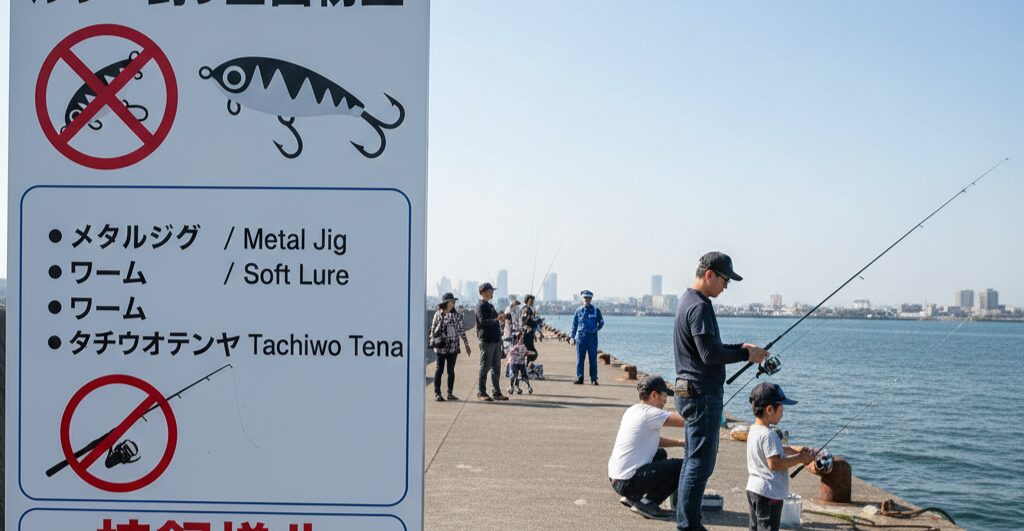最も重要なルール変更として、2021年4月1日より、鳴尾浜海釣り公園ではルアー類の使用が全面的に禁止されています。これは、釣りブームによる混雑の激化に伴い、キャスト時の接触事故やトラブルを防ぎ、子供からお年寄りまで安全に釣りを楽しめる環境を守るための措置です。