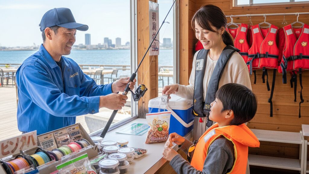 管理棟では、竿とリール、そしてサビキ仕掛けがセットになったレンタル竿が1,000円程度で用意されています。使い方も係員さんが親切に教えてくれるので、リールを触ったことがない初心者の方でも安心です。さらに、売店ではアミエビ(撒き餌)、氷、持ち帰り用の発泡スチロール製クーラーボックスまで販売されています。