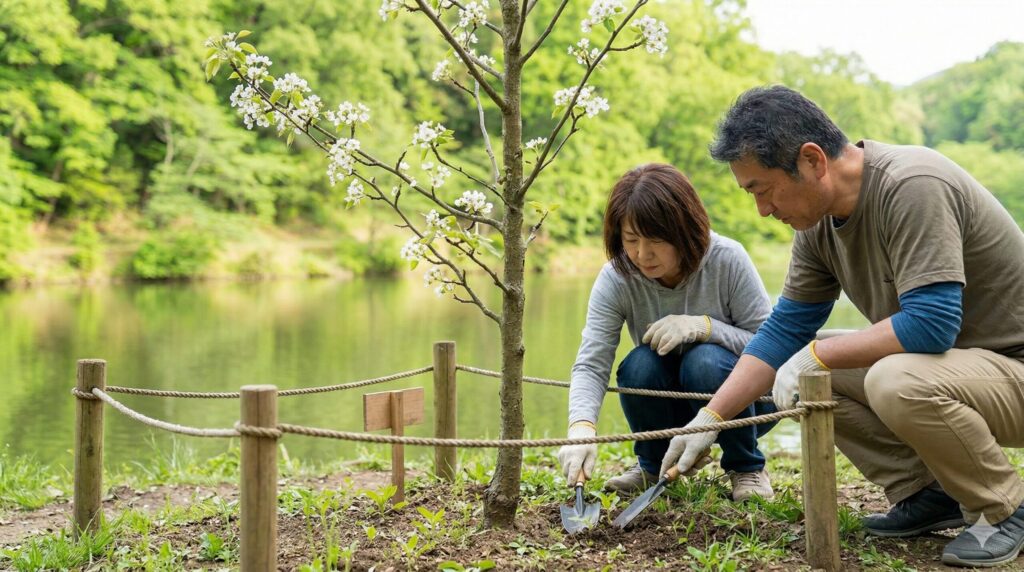 この貴重なマメナシを次世代に引き継ぐため、地元の方々による「風越池を美しくする会」や「上志段味マメナシ保存会」が、並々ならぬ情熱を持って活動されています。例えば、マメナシは日光を非常に好む性質があるため、放っておくと竹やカシなどの雑木に覆われて枯れてしまいます。そのため、保存会の方々は定期的に雑木の伐採や下草刈りを行い、マメナシが健やかに育つ環境を整えているんです。私たちが釣りを楽しめるのは、こうした地道なボランティア活動によって池の周辺が美しく維持されているからこそ、ということを忘れてはいけませんね。
