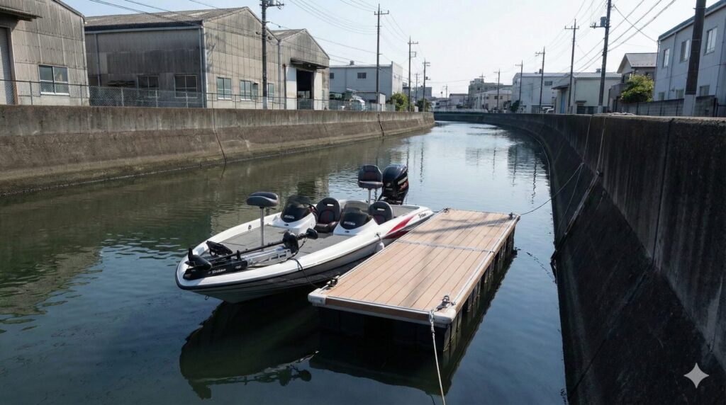 水路沿いにたどり着くと、複数のボートが縦列に繋がれています。Realの船は、一番奥から数えて3艇目に係留されていることが多いです。特徴は先ほどお伝えした通り、トライトン社製のバスボートタイプ(22SeaFlight)ですので、船体を見ればすぐに分かるはずです。キャプテンが準備をしている場合も多いので、到着したら軽く挨拶をして準備を始めましょう。初めての方にとってはこの「水路沿いに入る瞬間」が一番不安になるポイントだと思いますが、一度覚えてしまえば非常に分かりやすい立地ですよ。もしどうしても場所が分からない場合は、無理に探しまわらず、早めにキャプテンに電話で確認するのが正解です。